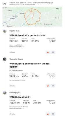 We vragen nog steeds om te rijden in onze clubuitrusting én om de GPS-opname en eventuele foto's van je prestatie te delen via sociale media (strava, instagram, whatsapp, e-mail, ...) met de vermelding "#WTC Huise rit 4". Wij zullen dan hieronder een compilatie van jullie foto's plaatsen en een virtueel klassement ("just for fun") bijhouden. En we zullen ook deze week opnieuw een attentie verloten onder de deelnemers. Volg het op onze website!